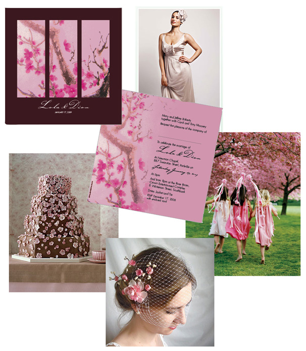 Clockwise from top left: wedding invitation, bridesmaid gown from Ava Madison, flowergirls from Martha Stewart Weddings, cherry blossom headpiece from Brides, cherry blossom cake from Martha Stewart Weddings.