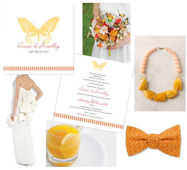 Clockwise form top left: Alannah Rose Butterfly Flutterby invitation, bouquet from Martha Stewart Weddings, necklace from Anthropologie, bowtie from Beau Ties Ltd, cocktail from Taste, Lanvin dress from Net A Porter.