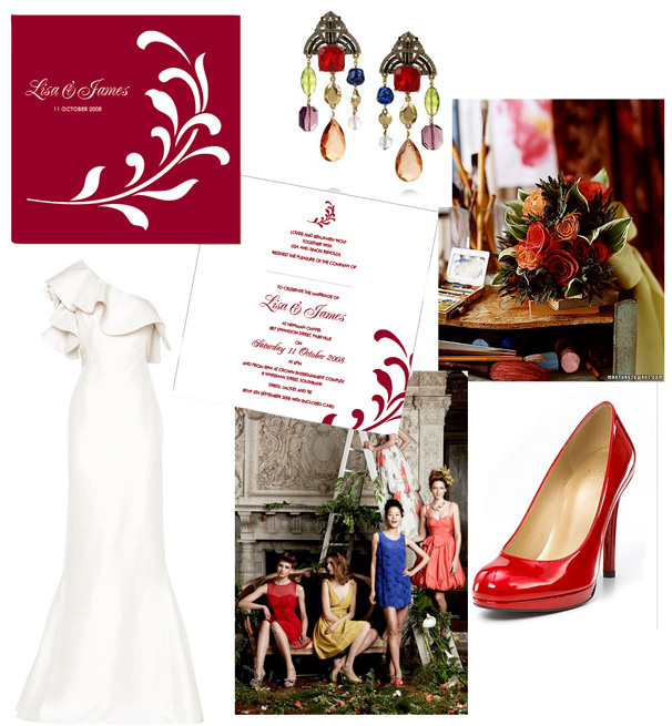 inspiration boards, weddingsI love the idea of taking our Love Me tender wedding invitation in it’s rich berry red and creating a jewel toned wedding around it. Bridesmaids in rich blues, reds, greens and golds, stunning multi-coloured earrings and a bold and elegant gown.