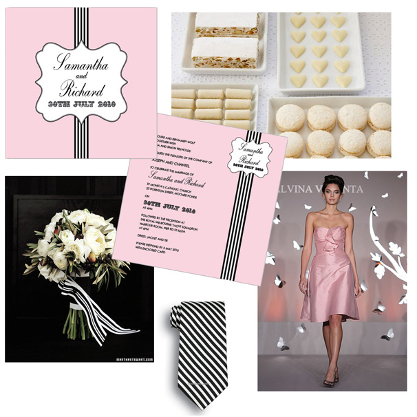 inspiration boards, weddingsTo me, The Alannah Rose Sweet Shoppe wedding invitation has always been traditional with a touch of retro glamour- the stripes add a little something special. Classic elements like a beautiful silk tie or clean white bouquet can have stripey details. Add a buffet full of white treats and sweet pink bridesmaids gowns to make it doubly delicious.