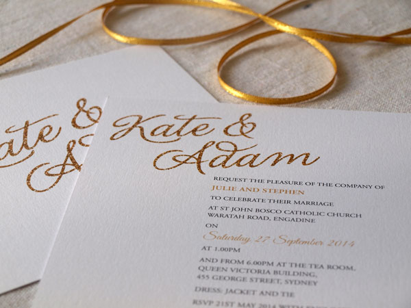 Our shimmer stock is the perfect way to make your invitations metallic without going to the extreme cost of foiling and hotstamping. Just pick a pretty gold from our colour chart and select your card stock as shimmer and voila, perfectly pretty metallic wedding invitations!