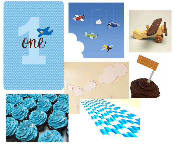 Clockwise from top left: Alannah Rose One Little LaLa Plane Party Invitation, Flensted Aeromobile Click-a-mobile from About Style, wooden airplane from stumpondtoy, cupcake flag from Details Details, blue striped straws from Details Details, cloud garland from Paperklip Design, cupcakes from Cakes and Art from Cupcakes Takes The Cake