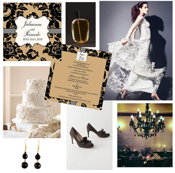 Clockwise from top left: Alannah Rose Cartouche Rose Invitation, Comme De Garcons Perfume from Urban Outfitters, Dress from Temperley London via Net A Porter, Guest of Wind pumps from Anthropologie, Feature wall with self gold floral print wall paper at Cafe’ Penne designed by Payal, Chopra. via Rang Decor, black earrings from Dani’s T Room, wedding cake from Martha Stewart Weddings,