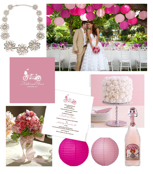 Clockwise from top left: Kate Spade Oops A Daisy necklace, picture from Martha Stewart Weddings, April Reed cake from The Knot, Hansi Pink Lemonade from Raw Materials, pink paper lanterns from Details Details, flowers from Martha Stewart Weddings, Alannah Rose Bicycle For Two Invitation in Pink