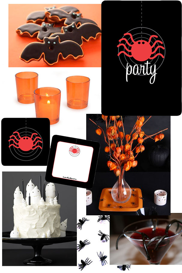 Clockwise from top left: Spooky bat cookies from Cookie Couture, Alannah Rose Spooky Spider Invitation, Tulip centrepiece photo from Hostess With The Mostess, Black Widow cocktail recipe & photo from Talk Of Tomatoes, Plastic spiders from 24-7 Party Pak, ghost cake from Martha Stewart, Alannah Rose Spooky Spider gift tags, orange votive candle holders from Candles D-Light.