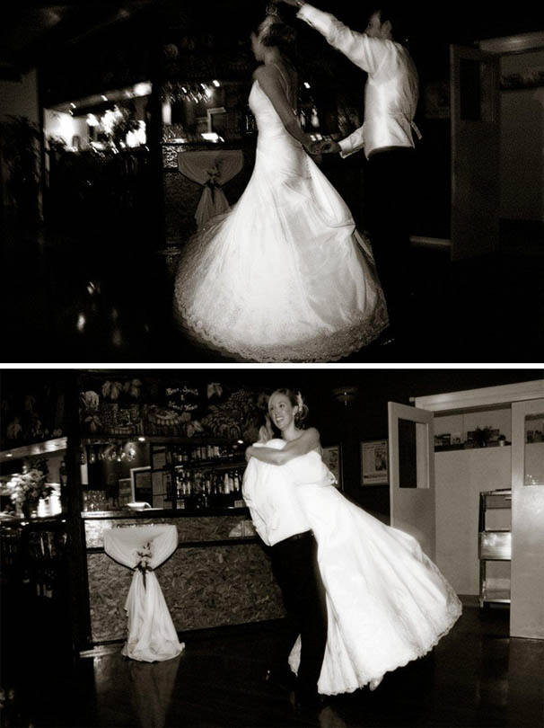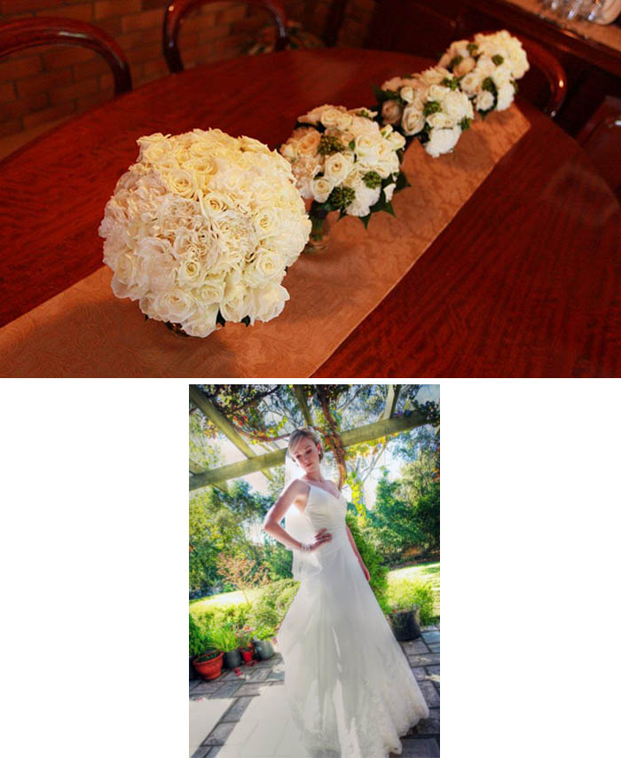 Above: Megan and Mark held their reception at Giardino Café. Giardino means “little farm or garden” in Italian and Kristy from the cafe helped style the wedding features. “We discussed with Kristy that we wanted to create a romantic, French country style atmosphere with lots of white flowers in tall vases and candles filling the tables.” says Megan. “She arranged everything and did such a beautiful job. We were absolutely delighted when we walked into the reception – it was so much more lovely than we had even imagined!”.