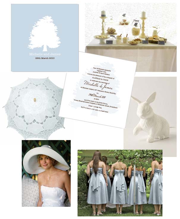 Clockwise form top left: Alannah Rose What A Lovely Day Wedding Invitation, Dessert buffet from Imbue Weddings via Polka Dot Bride, ceramic rabbit from Anthropologie, Bridesmaids photo from Country Living, hat photo from Martha Stewart Weddings, lace parasol from Pink Frosting.