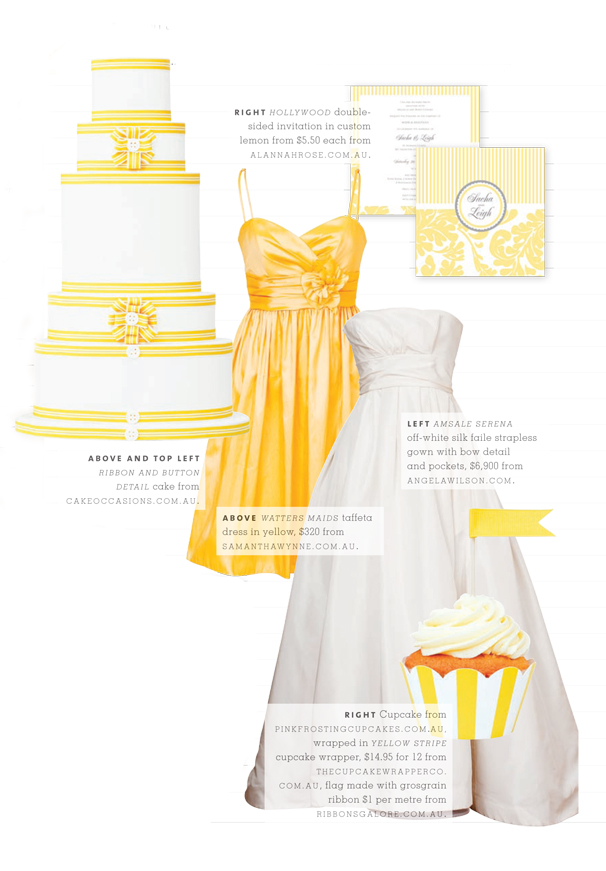 inspiration boards, media and press, weddingsThe lovely girls at Wedding Style Guide have featured our work again in their new Spring Issue. This issue is huge and full of so many gorgeous ideas. I love this pretty yellow inspiration page featuring our Hollywood Nights wedding invitation design in custom yellow.