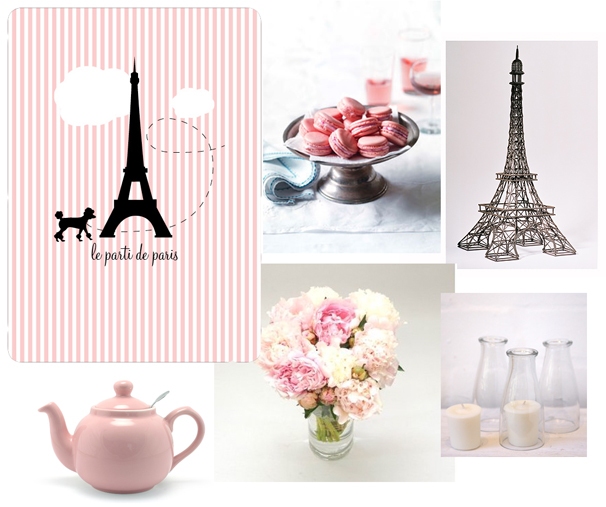 Clockwise form top left: Alannah Rose La Parti De Paris Invitation, Macaroons from Gourmet Traveller, Iron Eiffel Tower from Paris France Products, Tea Light candle holders from Love, Loans & Linen, Peonies from Just Picked, Teapot from Peters Of Kensington