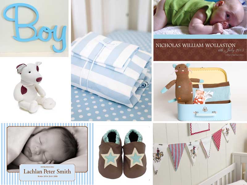 For the boys. Clockwise from top left: Custom Name Letters from Rondeau Industries, Cot Sheet Set from Red Plum Linen, Chocolate Dream Baby Thank You Card from Alannah Rose, Eeek It Gift Case from Monkey Caboose, Bunting from Red Plum Linen, Super Star Baby Shoes from Cheeky Little Soles, Blue Chocolatier Birth Announcement Card from Alannah Rose, Gertie Dog from Gertie and Me.