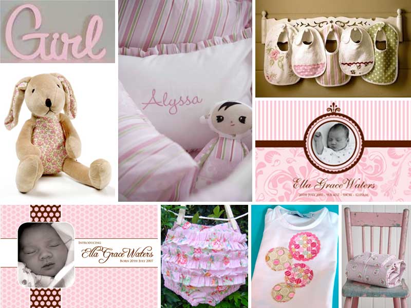 For the girls. Clockwise from top left: Custom Name Letters from Rondeau Industries, Personalised Throw Cushion from Red Plum Linen, Bibs from Red Plum Linen, Pink Flourish Baby Thank You Card from Alannah Rose, Cot Sheet Set from Red Plum Linen, Pink Spots t-shirt from Nic Macisaac, Ruffle Pants from Posh Print Designs, Pretty Little Polka Dot Birth Announcement Card from Alannah Rose, Lulu Bunny from Gertie and Me