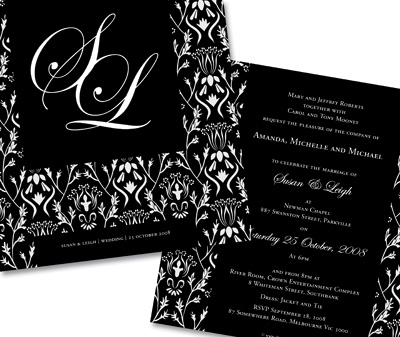 Above: Flourish Black and White Wedding invitation with monogram from Alannah Rose and Pink Frosting.