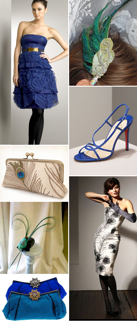 Clockwise from top left: Valentino Lace-Rose Silk Dress from Neiman Marcus, Gemma Peacock Hair Comb from Whichgoose Etsy, Christian Louboutin sandal from Neiman Marcus , Audrey Peacock Feathers gown from Mira Mandic, Nadia Minkoff evening bags from Roost Living, Pina Colada Headpiece from Ward and Wylie, Silk Peacock Feathers luxury clutch bag from RedRubyRose etsy.