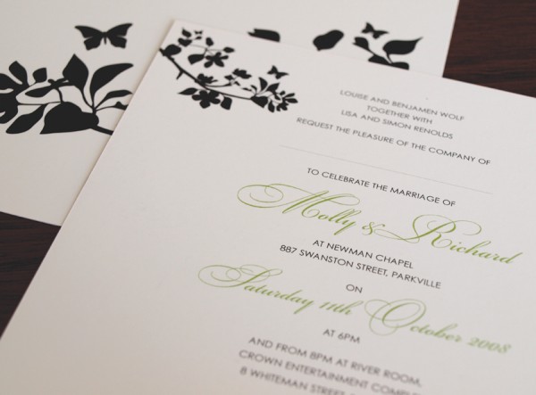 Above: Butterfly Garden wedding invitation in black & white with a dash of lime