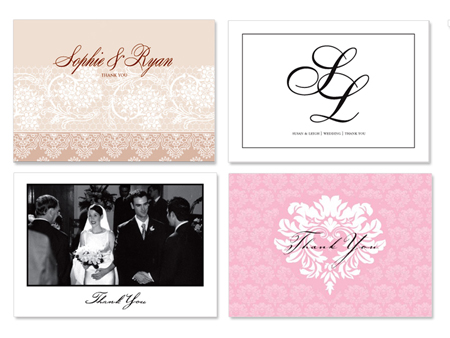 Wedding Thank you cards available from Alannah Rose. Clockwise from top left: Latte Lace Folding Thank You Card, Embellish Monogram Thank You Card, True Romance Thank You Card and Style Wedding Photo Thank You Card. More styles available in the online boutique.