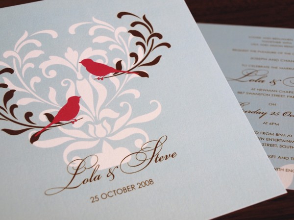 above: two little birds wedding invitation in blue, chocolate and white. this will also be available in pink.