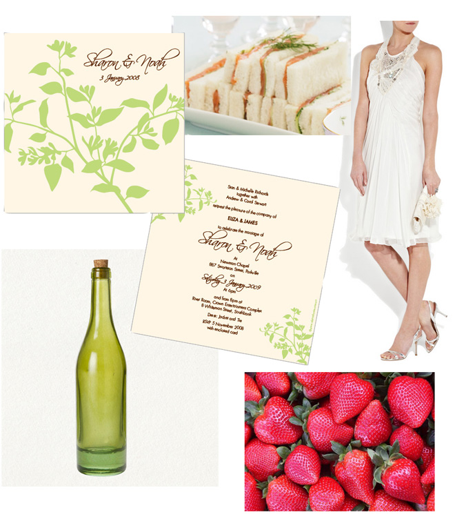 Clockwise from top left: Alannah Rose Lime Garden Soiree Wedding Invitation. cucumber finger sandwiches from Taste, Alberta Ferretti Chiffon Dress from Net A Porter, strawberries from Sunnyridge, beach bottle from Terrain.