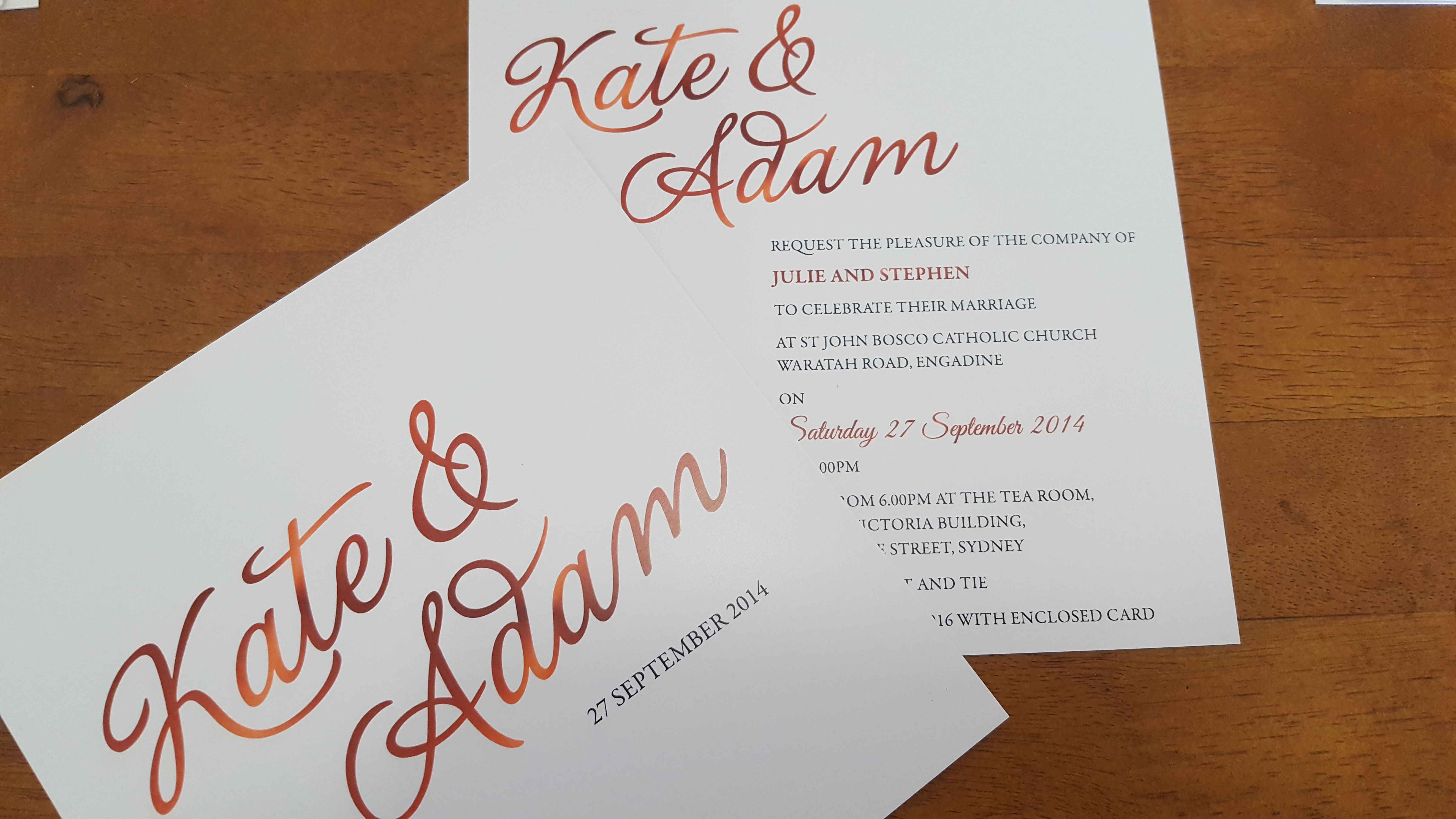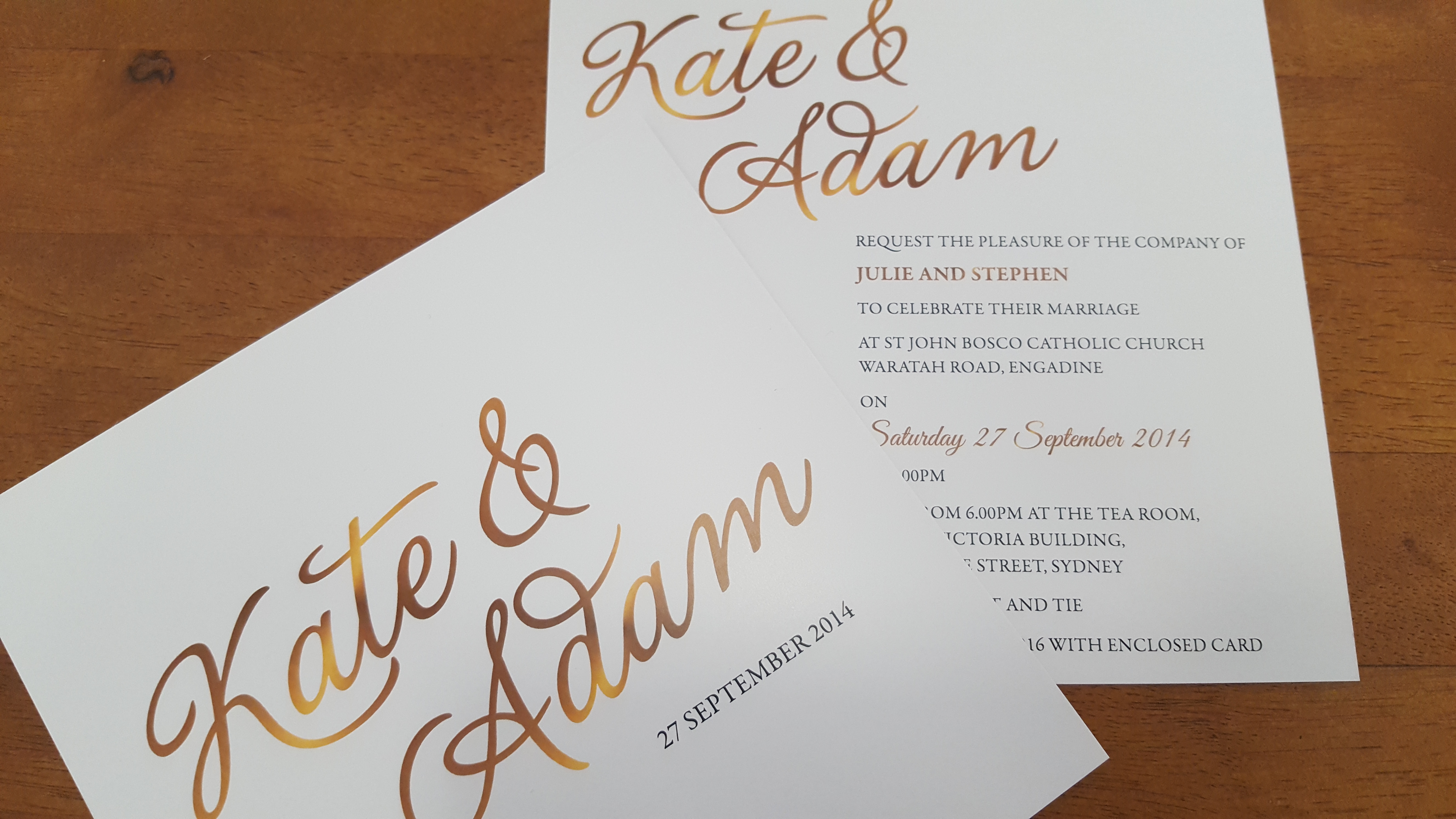 alannah rose new designs, wedding invitationsWho doesn’t love the look of metallic gold foil? Gold foiling adds that extra level of class and luxury to invitations and stationery but generally also comes with a high price tag. Given that the production process of traditional hot foil stamping is expensive and takes a lot of time and resources, traditional gold foiling methods are usually unobtainable for the average bride with a budget. The costs involved generally make foiling more appealing for smaller weddings and functions and cannot be applied to wide format options, such as large guest seating charts. In addition, the high price of traditional foil stamping can also limit brides to only be able to afford to foil their wedding invitations and RSVPs and have to settle for a different design and print for their menus, table numbers, bonbonnieres, service covers, guest seating chart and thank you cards.