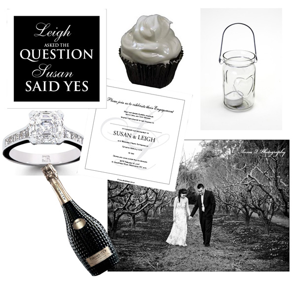 Clockwise from top left: Alannah Rose She Said Yes Engagement Invitation, Cloud Nine cupcake from Cupcakes by Paolo, glass heart lantern from Emerald + Ella, black and white photo from Annie Q Photography via Polka Dot Bride, Nicolas Feuillatte Palmes D’Or Champagne from The Champagne Gallery, diamond ring from Charles Rose.