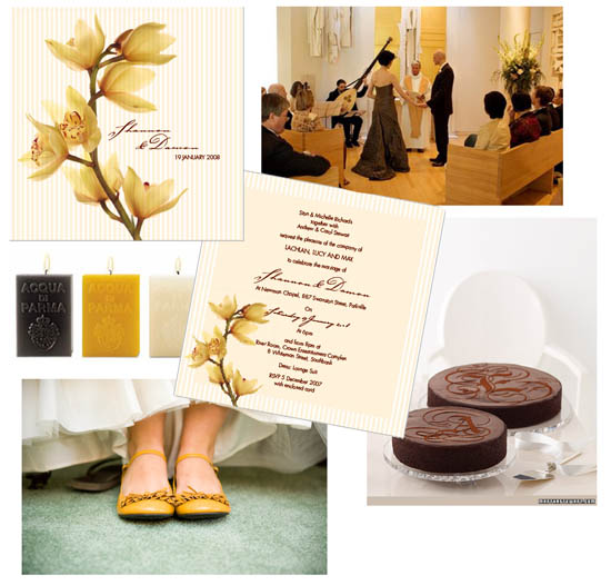 Clockwise form top left: Alannah Rose Orchid Belle Invitation, Ceremony photo by Jocelyn Filley from Snippet & Ink, cakes from Martha Stewart Weddings, yellow wedding shoes photo from Snippet & Ink, Acqua Di Parma candles from Neiman Marcus.