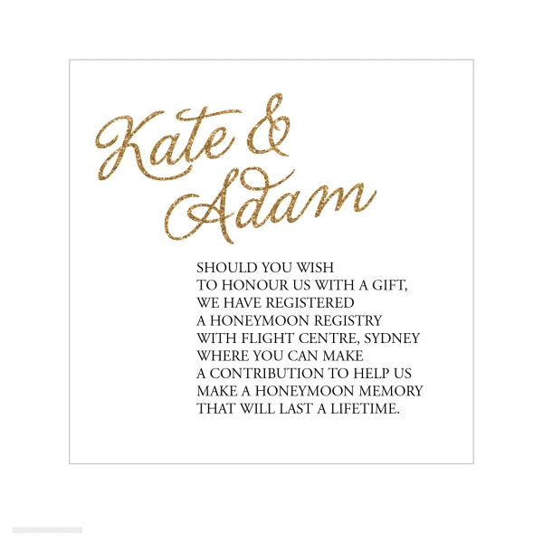 Add a little glitz to your day with this smart glitter print design. The graphic is a photo of glitter printed on the card (not real glitter or foil), so for extra sparkle select the shimmer stock, but they look just as lovely on the others too! These cards are ideal for those wishing to advise guests of gift or wishing well ideas. They are printed to one side only on Satin Deluxe card stock, and are perfect for slipping into the envelope with the invitation. Shimmer or Textured card stock is available at an additional charge. For those with extra text, we can print to the reverse for an additional charge. Flat size 68x68mm