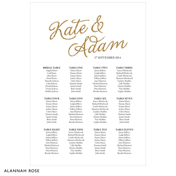 Add a little glitz to your day with this smart glitter print design. The graphic is a photo of glitter printed on the card (not real glitter or foil), so for extra sparkle select the shimmer stock, but they look just as lovely on the others too! (note shimmer not available on A2 or A1 sizes). This sweet guest seating chart is printed on poster stock and is the perfect way to help your guests find their table.
