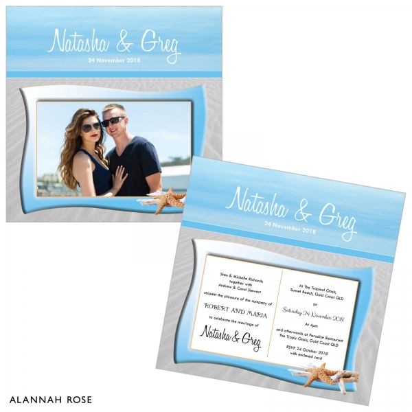 These double sided invitations are sure to leave a lasting impression on your guests. Square card invitation printed to both sides on a Satin Deluxe card stock. Shimmer or Textured card stock is available with additional charge. Envelopes are included (smooth white envelopes are provided for Textured card stock). Guest names can be printed on invitations and/or envelopes, please select the personalisation option if you require this. Other colour options are available please see our colour chart for details. Flat size 140 x 140mm.