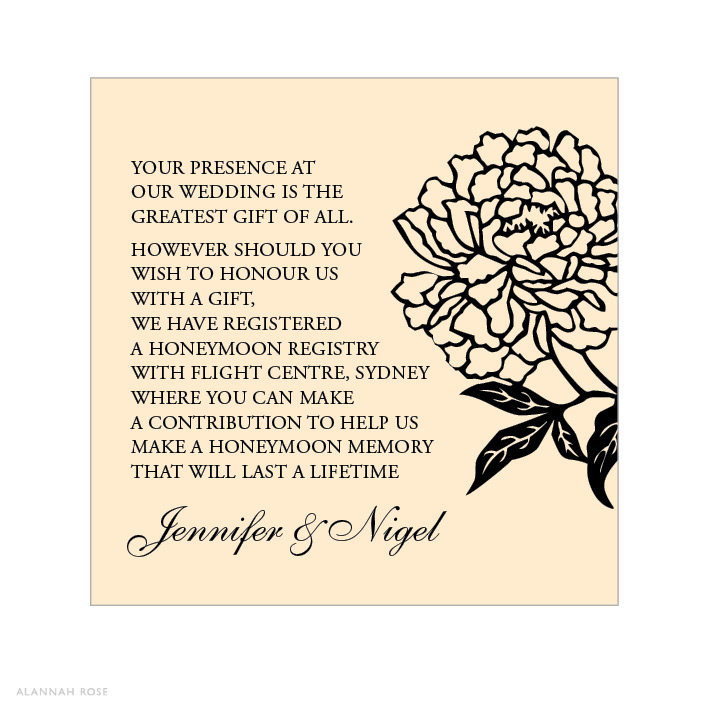 These cards are ideal for those wishing to advise guests of gift or wishing well ideas. They are printed to one side only on Satin Deluxe card stock, and are perfect for slipping into the envelope with the invitation. Shimmer or Textured card stock is available at an additional charge. For those with extra text, we can print to the reverse for an additional charge. Flat size 68x68mm