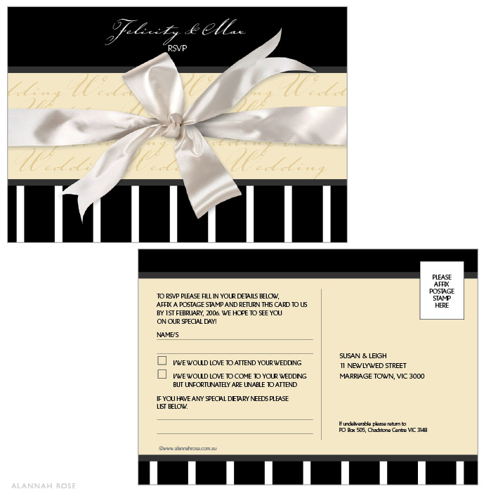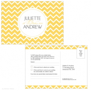 These beautiful RSVP postcards are printed double sided and are an easy and convenient way to have your guests RSVP. All they need to do is fill in their details, place a postage stamp on the back and post it – no envelopes required! Printed on a high quality Satin Deluxe card stock. Shimmer or Textured card stock is available at an additional charge. Flat size 140 x 100mm