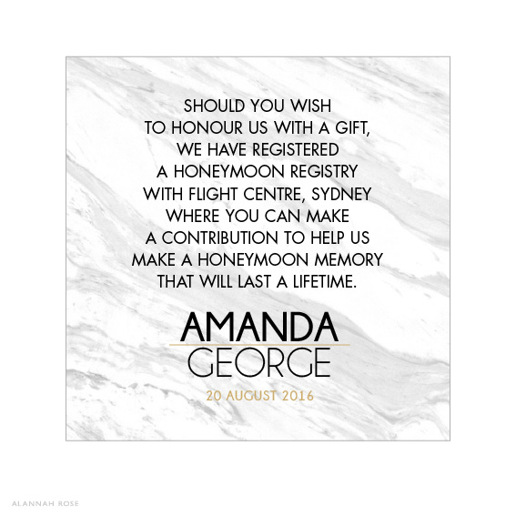 These marble look cards are ideal for those wishing to advise guests of gift or wishing well ideas. They are printed to one side only on Satin Deluxe card stock, and are perfect for slipping into the envelope with the invitation. Shimmer or Textured card stock is available at an additional charge. For those with extra text, we can print to the reverse for an additional charge. Flat size 68x68mm