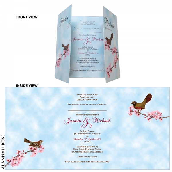 This wedding invitation is gate-folded to produce cover flaps that entice the reader to open the invite and look inside. This invitation is printed on a high quality 350gsm Satin Deluxe card stock.