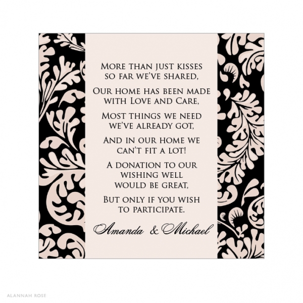 These cards are ideal for those wishing to advise guests of gift or wishing well ideas. They are printed to one side only on Satin Deluxe card stock, and are perfect for slipping into the envelope with the invitation. Shimmer or Textured card stock is available at an additional charge. For those with extra text, we can print to the reverse for an additional charge. Flat size 68x68mm