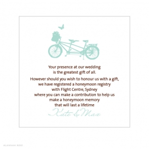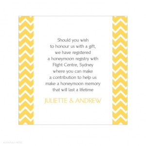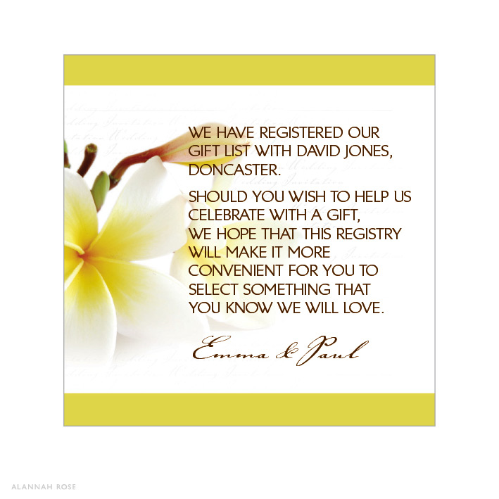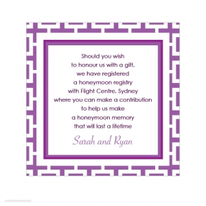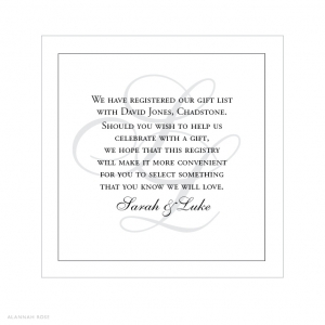 These cards are ideal for those wishing to advise guests of gift or wishing well ideas. They are printed to one side only on Satin Deluxe card stock, and are perfect for slipping into the envelope with the invitation. Shimmer or Textured card stock is available at an additional charge. For those with extra text, we can print to the reverse for an additional charge. Flat size 68x68mm