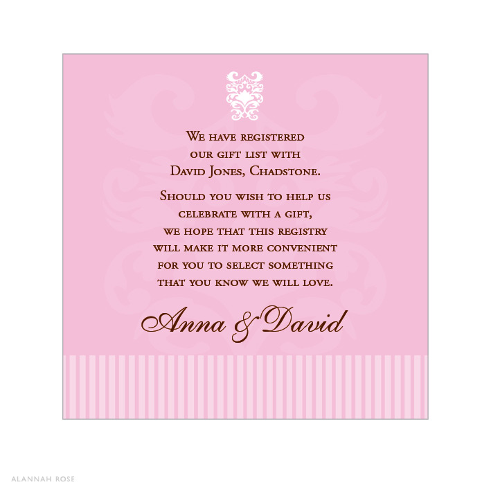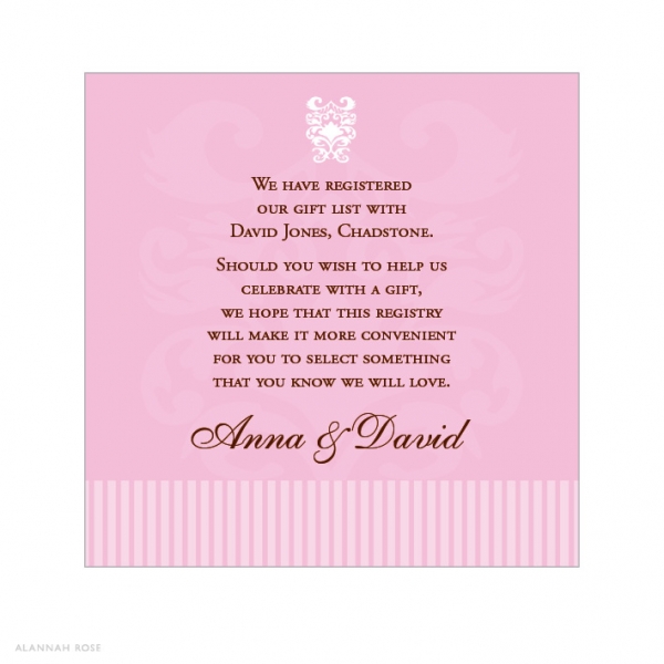 These cards are ideal for those wishing to advise guests of gift or wishing well ideas. They are printed to one side only on Satin Deluxe card stock, and are perfect for slipping into the envelope with the invitation. Shimmer or Textured card stock is available at an additional charge. For those with extra text, we can print to the reverse for an additional charge. Flat size 68x68mm