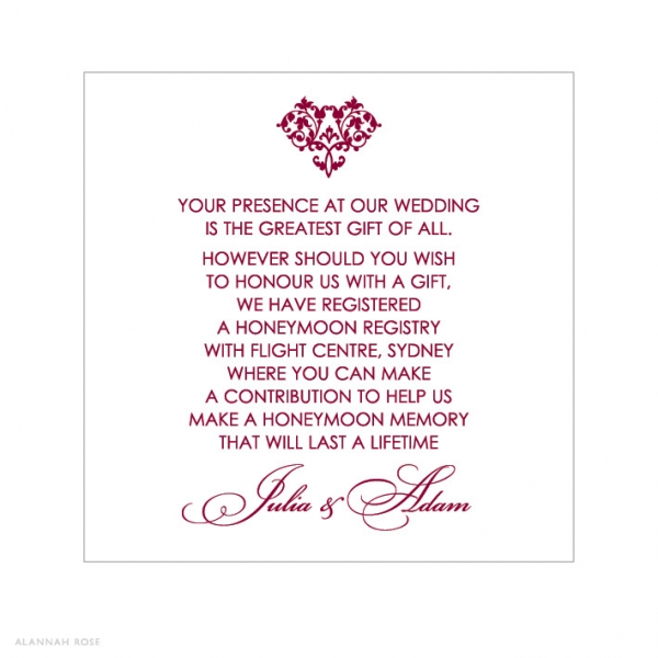 These cards are ideal for those wishing to advise guests of gift or wishing well ideas. They are printed to one side only on Satin Deluxe card stock, and are perfect for slipping into the envelope with the invitation. Shimmer or Textured card stock is available at an additional charge. For those with extra text, we can print to the reverse for an additional charge. Flat size 68x68mm