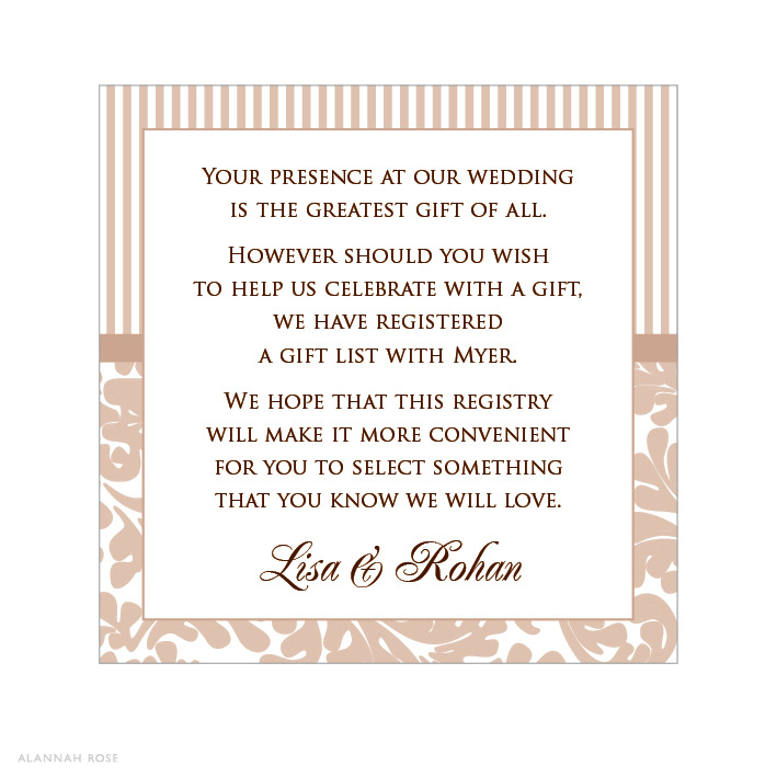 These cards are ideal for those wishing to advise guests of gift or wishing well ideas. They are printed to one side only on Satin Deluxe card stock, and are perfect for slipping into the envelope with the invitation. Shimmer or Textured card stock is available at an additional charge. For those with extra text, we can print to the reverse for an additional charge. Flat size 68x68mm