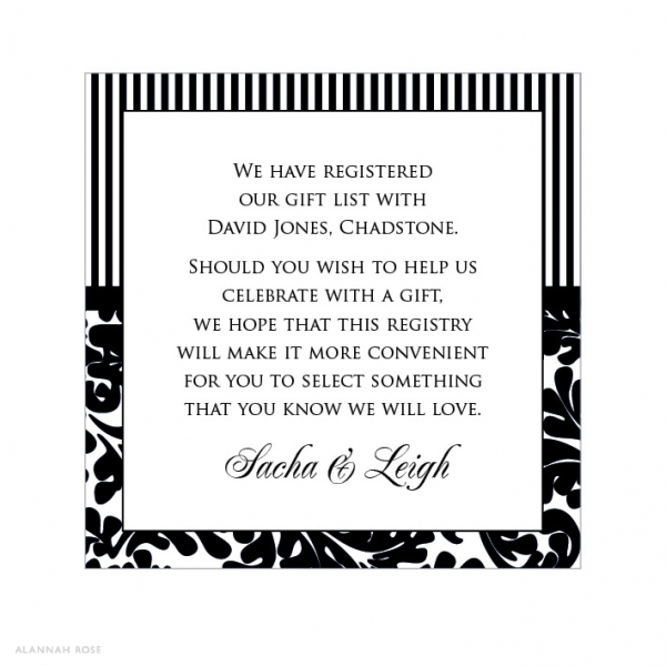 These cards are ideal for those wishing to advise guests of gift or wishing well ideas. They are printed to one side only on Satin Deluxe card stock, and are perfect for slipping into the envelope with the invitation. Shimmer or Textured card stock is available at an additional charge. For those with extra text, we can print to the reverse for an additional charge. Flat size 68x68mm