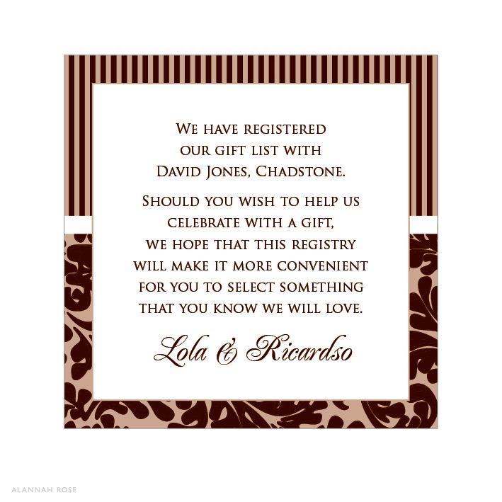 These cards are ideal for those wishing to advise guests of gift or wishing well ideas. They are printed to one side only on Satin Deluxe card stock, and are perfect for slipping into the envelope with the invitation. Shimmer or Textured card stock is available at an additional charge. For those with extra text, we can print to the reverse for an additional charge. Flat size 68x68mm