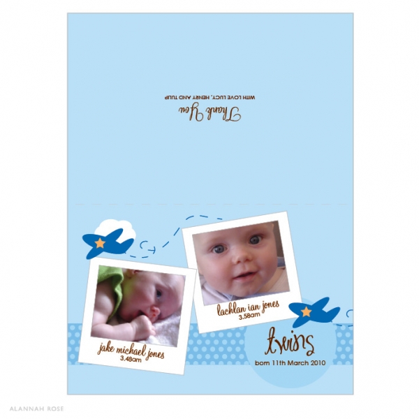Gorgeous baby thank you cards for your new baby. Announce the arrival of your little one in style! These cards are folding style, printed on a 350gsm Satin Deluxe card stock and come with white envelopes. The inside is left blank for you to write your personal message. A generic message can be printed to the inside of the card for an additional charge. Please select the option below if you would like this.