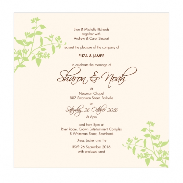 These single sided wedding invitations are sure to leave a lasting impression on your guests. Square card invitation printed to the front side only on a Satin Deluxe card stock. Shimmer or Textured card stock is available at an additional charge. Envelopes are included (smooth white envelopes are provided for Textured card stock). Guest names can be printed on invitations and/or envelopes, please select the personalisation option if you require this. Other colour options are available please see our colour chart for details. Flat size 140 x 140mm.