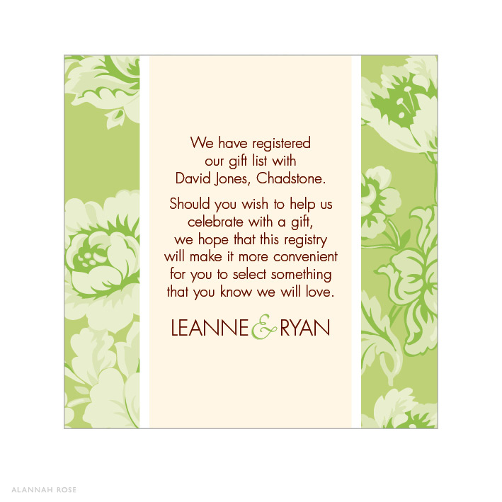 These cards are ideal for those wishing to advise guests of gift or wishing well ideas. They are printed to one side only on Satin Deluxe card stock, and are perfect for slipping into the envelope with the invitation. Shimmer or Textured card stock is available at an additional charge. For those with extra text, we can print to the reverse for an additional charge. Flat size 68x68mm