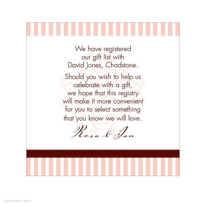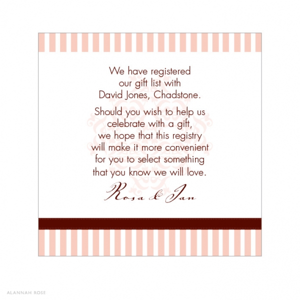 These cards are ideal for those wishing to advise guests of gift or wishing well ideas. They are printed to one side only on Satin Deluxe card stock, and are perfect for slipping into the envelope with the invitation. Shimmer or Textured card stock is available at an additional charge. For those with extra text, we can print to the reverse for an additional charge. Flat size 68x68mm