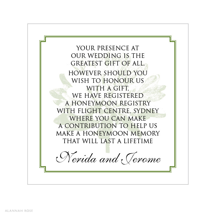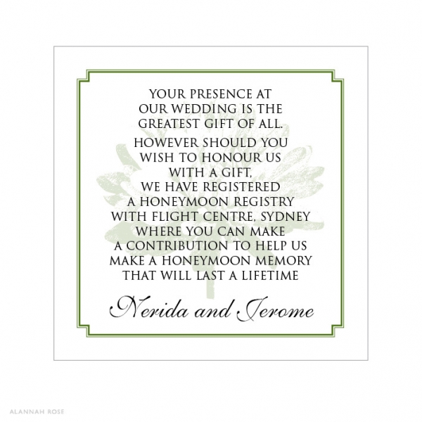 These cards are ideal for those wishing to advise guests of gift or wishing well ideas. They are printed to one side only on Satin Deluxe card stock, and are perfect for slipping into the envelope with the invitation. Shimmer or Textured card stock is available at an additional charge. For those with extra text, we can print to the reverse for an additional charge. Flat size 68x68mm