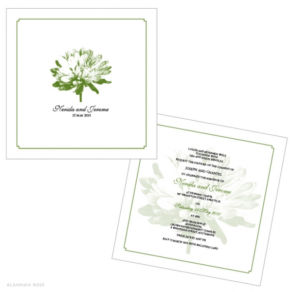 These double sided invitations are sure to leave a lasting impression on your guests. Square card invitation printed to both sides on a Satin Deluxe card stock. Shimmer or Textured card stock is available with additional charge. Envelopes are included (smooth white envelopes are provided for Textured card stock). Guest names can be printed on invitations and/or envelopes, please select the personalisation option if you require this. Other colour options are available please see our colour chart for details. Flat size 140 x 140mm.
