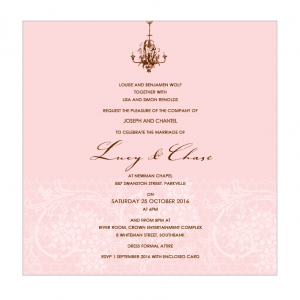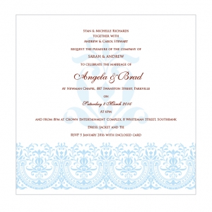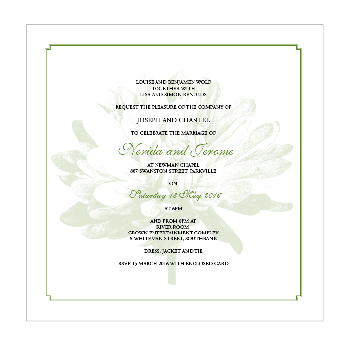 These single sided wedding invitations are sure to leave a lasting impression on your guests. Square card invitation printed to the front side only on a Satin Deluxe card stock. Shimmer or Textured card stock is available at an additional charge. Envelopes are included (smooth white envelopes are provided for Textured card stock). Guest names can be printed on invitations and/or envelopes, please select the personalisation option if you require this. Other colour options are available please see our colour chart for details. Flat size 140 x 140mm.