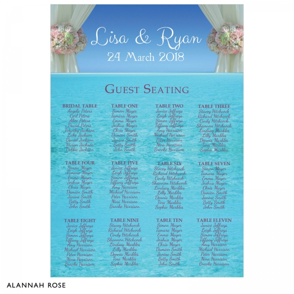 This guest seating chart is the perfect way to help your guests find their table. Choose from our Glossy Poster Stock for insertion into a frame of your choice or order our Self-adhesive Stock, which you can adhere to a solid backing board, such foam board or corflute.