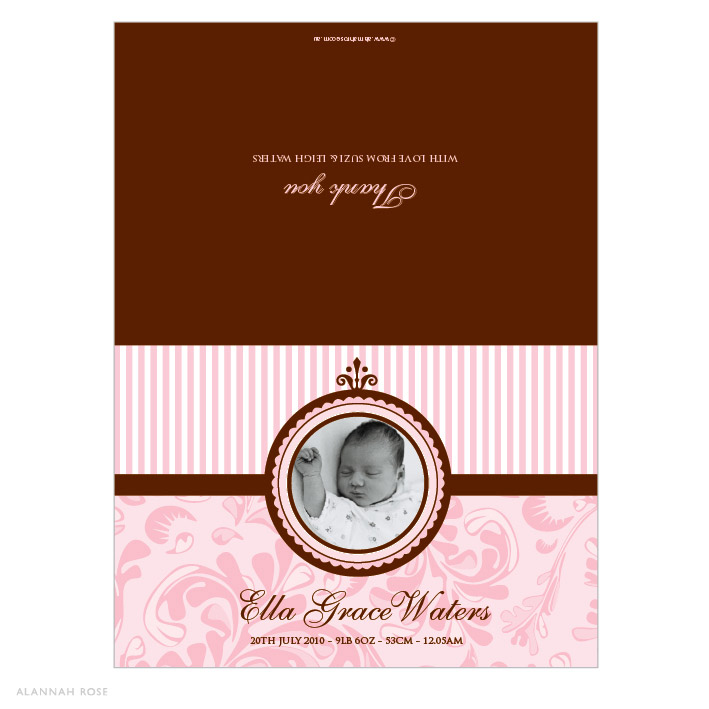 Gorgeous baby thank you cards for your new baby. Announce the arrival of your little one in style! These cards are folding style, printed on a 350gsm Satin Deluxe card stock and come with white envelopes. The inside is left blank for you to write your personal message. A generic message can be printed to the inside of the card for an additional charge. Please select the option below if you would like this.