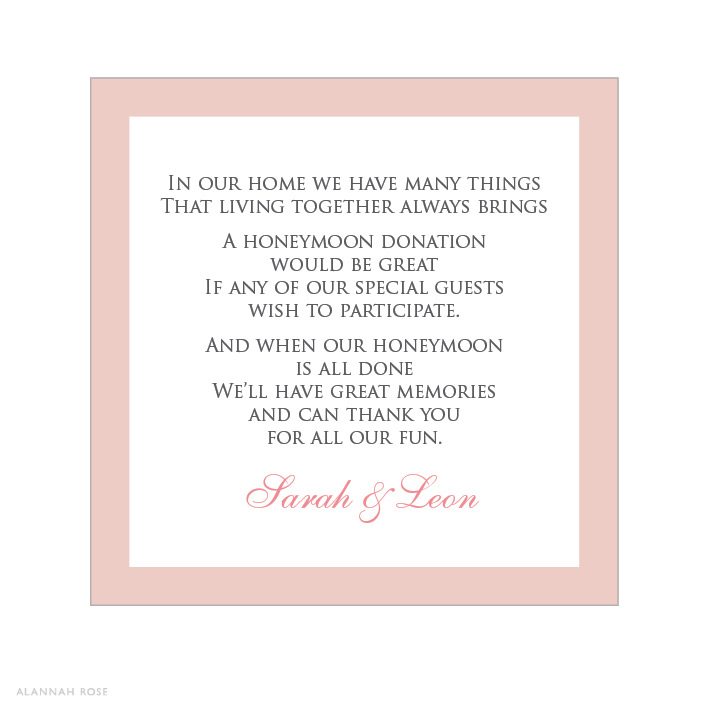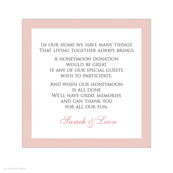 These cards are ideal for those wishing to advise guests of gift or wishing well ideas. They are printed to one side only on Satin Deluxe card stock, and are perfect for slipping into the envelope with the invitation. Shimmer or Textured card stock is available at an additional charge. For those with extra text, we can print to the reverse for an additional charge. Flat size 68x68mm