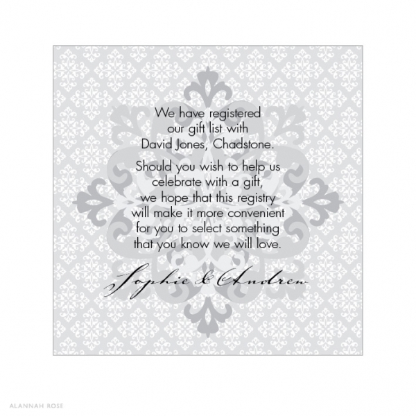 These cards are ideal for those wishing to advise guests of gift or wishing well ideas. They are printed to one side only on Satin Deluxe card stock, and are perfect for slipping into the envelope with the invitation. Shimmer or Textured card stock is available at an additional charge. For those with extra text, we can print to the reverse for an additional charge. Flat size 68 x 68mm