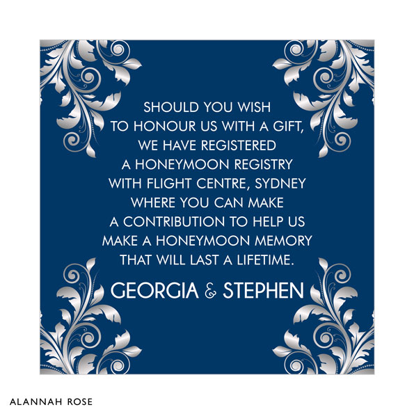 These cards are ideal for those wishing to advise guests of gift or wishing well ideas. They are printed to one side only on Satin Deluxe card stock, and are perfect for slipping into the envelope with the invitation. Shimmer or Textured card stock is available at an additional charge. For those with extra text, we can print to the reverse for an additional charge. Flat size 68 x 68mm.